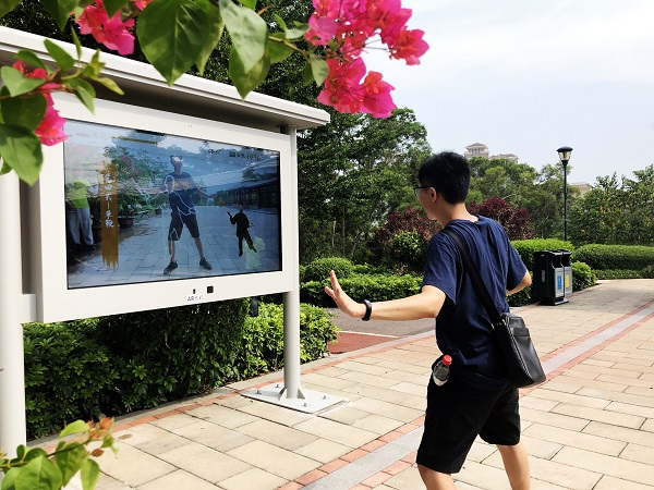 接下來(lái)我們?nèi)ンw驗(yàn)?zāi)抢锏腁R太極,AR太極是傳統(tǒng)的太極與AI和AR技術(shù)相結(jié)合,實(shí)現(xiàn)面對(duì)面實(shí)時(shí)的虛擬教學(xué)。參與者只需要按照智能大屏提示舉起右手,通過人工智能領(lǐng)域人體肢體識(shí)別技術(shù)判斷后自動(dòng)開啟互動(dòng)。過程中會(huì)自動(dòng)識(shí)別并計(jì)算參與者動(dòng)作并給與相應(yīng)分?jǐn)?shù),無(wú)論您會(huì)不會(huì)太極拳,跟著這位“太極大師”都能打得很好。AR太極將會(huì)給您帶來(lái)無(wú)限的運(yùn)動(dòng)樂趣。