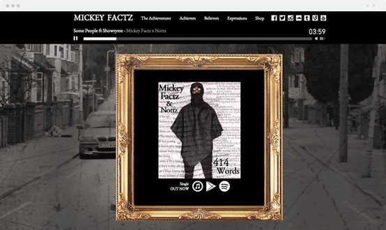前面說到了視頻背景/動(dòng)畫對(duì)于網(wǎng)站的作用。如果你是音樂家,為什么不向人們展示一下你的音樂才華呢?Mickey Factz就在自己的網(wǎng)站頁眉中加入了他的音樂,很有創(chuàng)意。