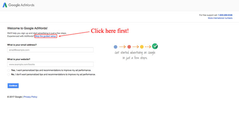 3. 當(dāng)歡迎頁面Welcome to Google Adwords!加載完成后,點擊藍(lán)色鏈接Skip the guided tour(參考上圖)。