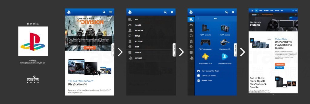 PlayStation在第一層選單點(diǎn)擊后,左側(cè)保留原本第一層分類圖,右側(cè)顯示第二層分類,清楚讓使用者知道現(xiàn)在在哪一個(gè)類別之下,使用者在做上一個(gè)類別切換時(shí),不需回到上一層做選擇。