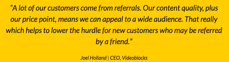 制作一支原生影片所使用到的素材可能會(huì)非常昂貴,但是Video Block 顛覆了業(yè)界的常規(guī),它提供影片素材,從短片、背景、特殊效果、甚至到AfterEffects 范本等,不論每個(gè)月下載多少內(nèi)容,都均一收費(fèi),但現(xiàn)在Referral Program 并沒(méi)有直接在網(wǎng)站上揭露。不過(guò)根據(jù) Video Block 的 CEO 的引言,推薦營(yíng)銷的策略的確讓他們更不費(fèi)力地招來(lái)更多許多新客戶,而 Refferral Candy 的個(gè)案研究也顯示出 Video Blocks 透過(guò)推薦營(yíng)銷賺進(jìn) 10 萬(wàn)美元。