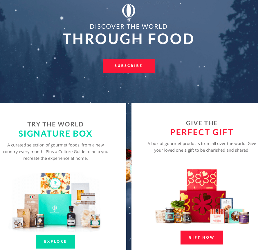 Try the World 創(chuàng)辦的概念有點(diǎn)類似于此。創(chuàng)辦人因?yàn)橄矚g旅行和美食,對(duì)于在異國(guó)嘗到的料理常常難以忘懷,便想要在自己的家里重現(xiàn)他們?cè)诼眯袝r(shí)的當(dāng)?shù)刈钕矚g的菜,然而礙于異國(guó)食材在美國(guó)取得不易,于是他們便創(chuàng)辦了Try the World,讓人們可以透過(guò)在家里訂購(gòu)他們?yōu)槟闩渲煤玫漠悋?guó)料理發(fā)現(xiàn)盒,環(huán)游世界的飲食文化。